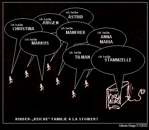 ICH KANN MICH NICHT DER VON STOIBER-KOMPETENZTEAM-MITGLIED FRAU KATHERINA REICHE IM DEUTSCHEN BUNDESTAG VORGETRAGENEN UND IM FOLGENDEN WIEDERGEGEBENEN AUFFASSUNG (VOLLSTÄNDIGER TEXT ) ZUR STAMMZELLENFORSCHUNG ANSCHLIESSEN. DENN DIESE POSITION IST IM GENANNTEN SINNE FALSCH! ICH GEHE DARAUF IM FOLGENDEN EIN.